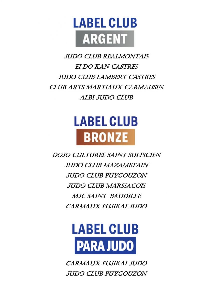 Après validation des dossiers par le Comité, 5 clubs tarnais ont obtenu le « LABEL ARGENT », 6 clubs tarnais ont obtenu le « LABEL BRONZE » et 2 clubs tarnais ont obtenu le « LABEL PARA JUDO »